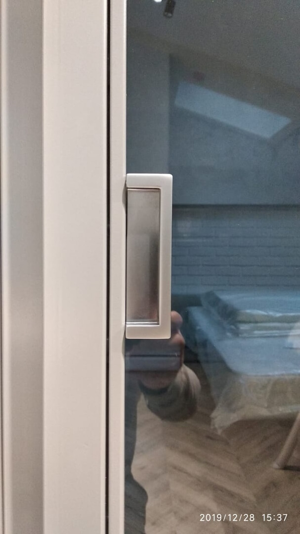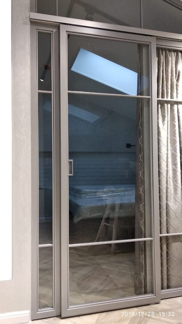 Мансардная ЛОФТ перегородка с раздвижной стеклянной дверью.
