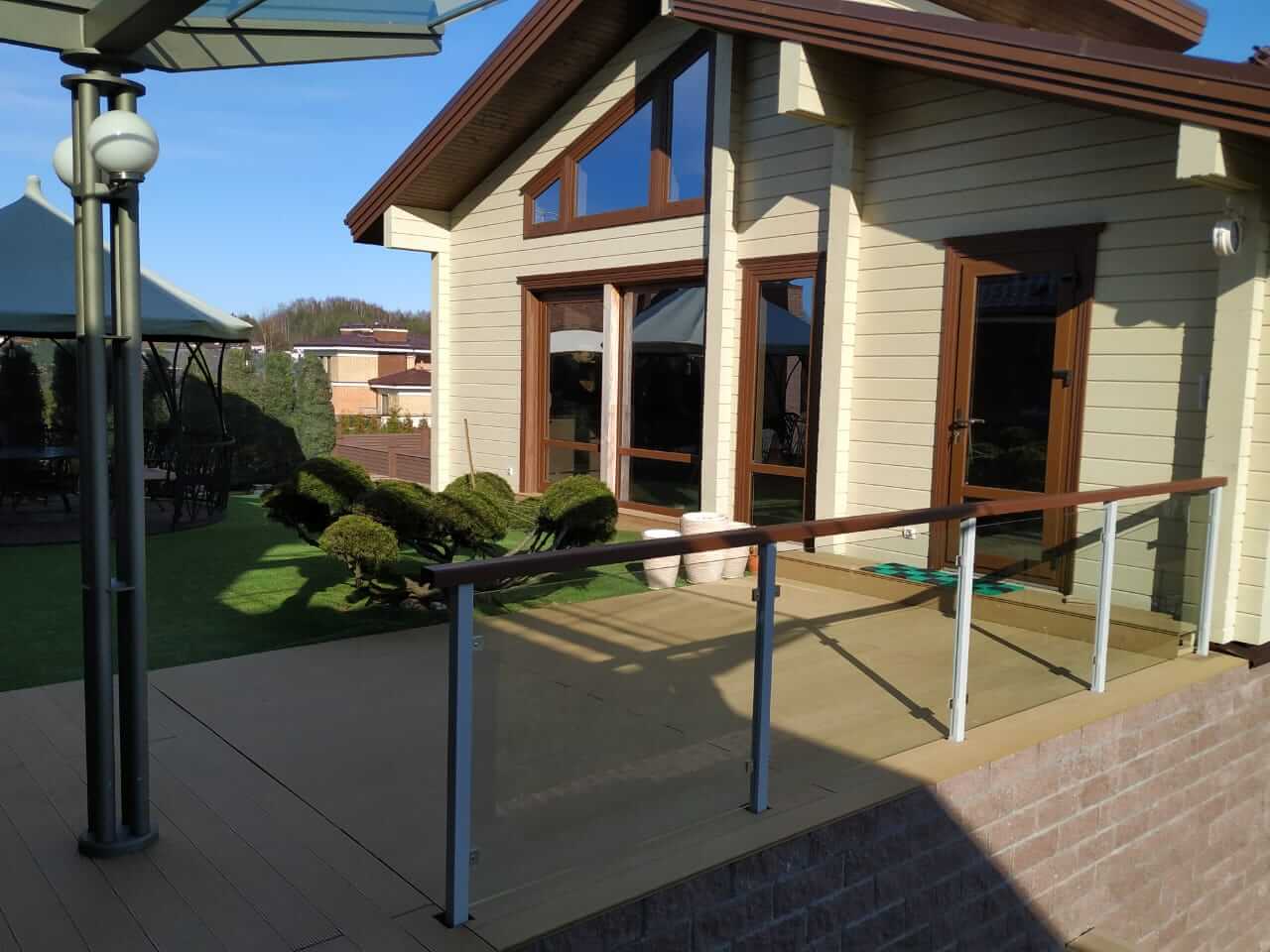Ограждение балкона терассы. Стоки - металл. Заполнение - закаленное стекло 8 мм