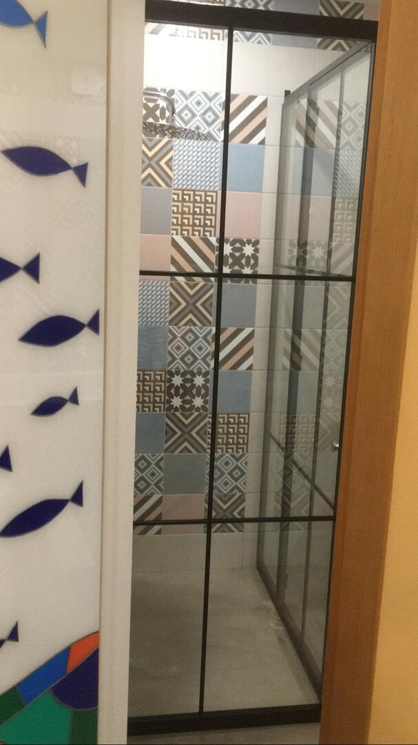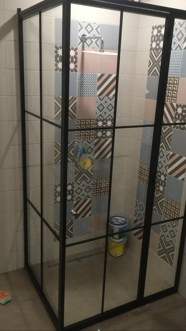 Стеклянная угловая душевая кабина в стиле ЛОФТ.
