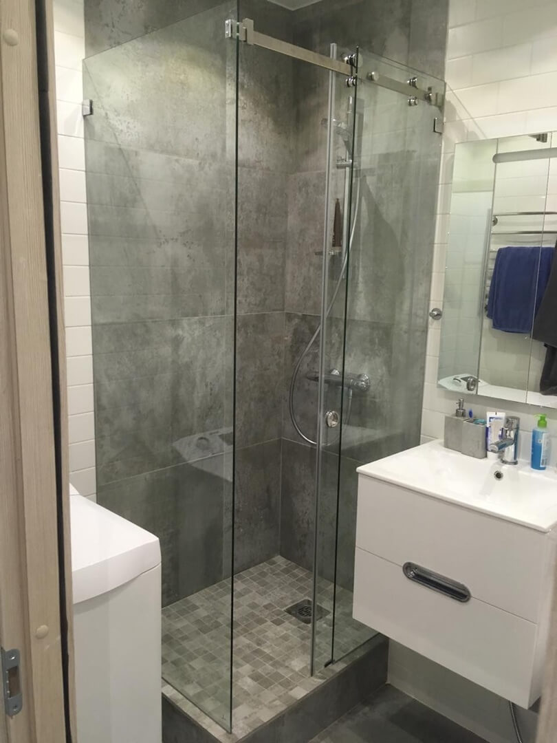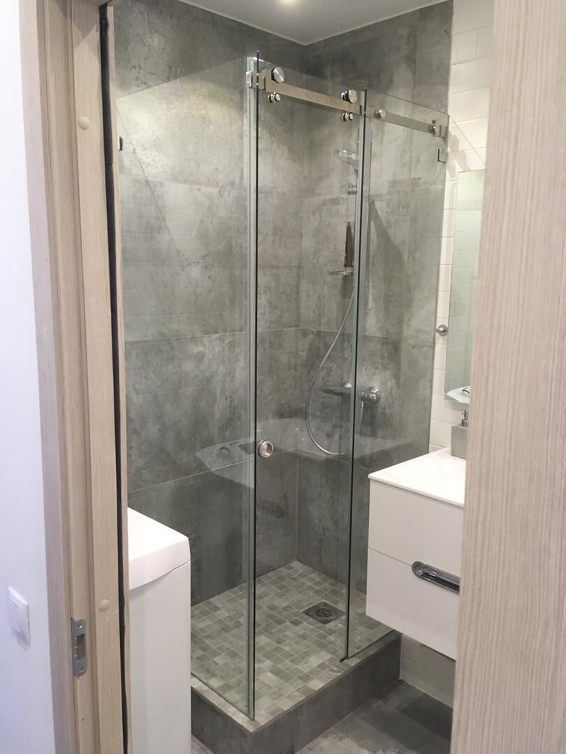 Угловое раздвижное стеклянное душевое ограждение.