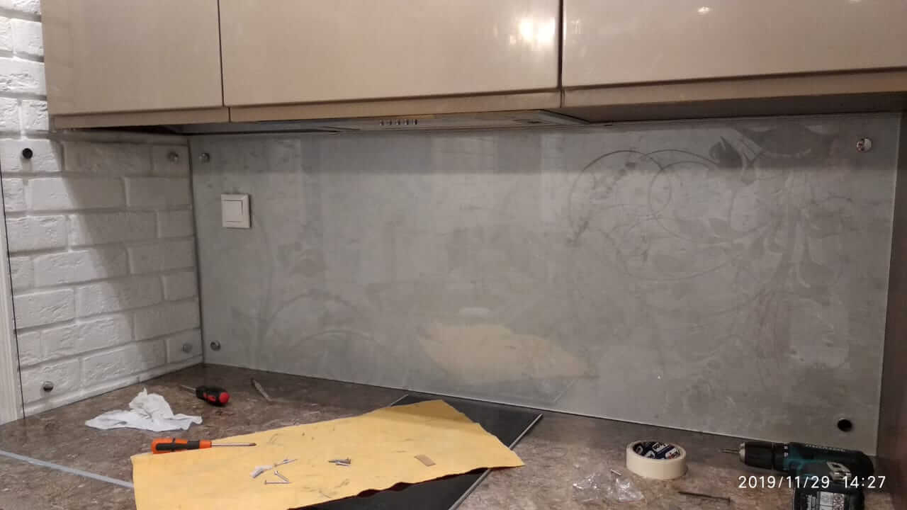 Кухонный фартук (скинали) из прозрачного, закаленного стекла 6 мм с пескоструйным рисунком.