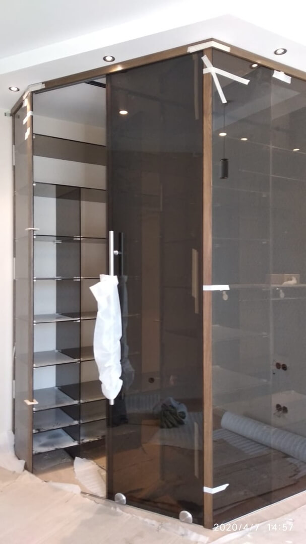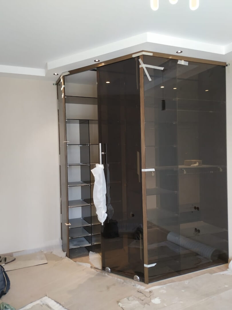Цельно стеклянный гардеробный шкаф с раздвижными дверями и стеклянными полками.