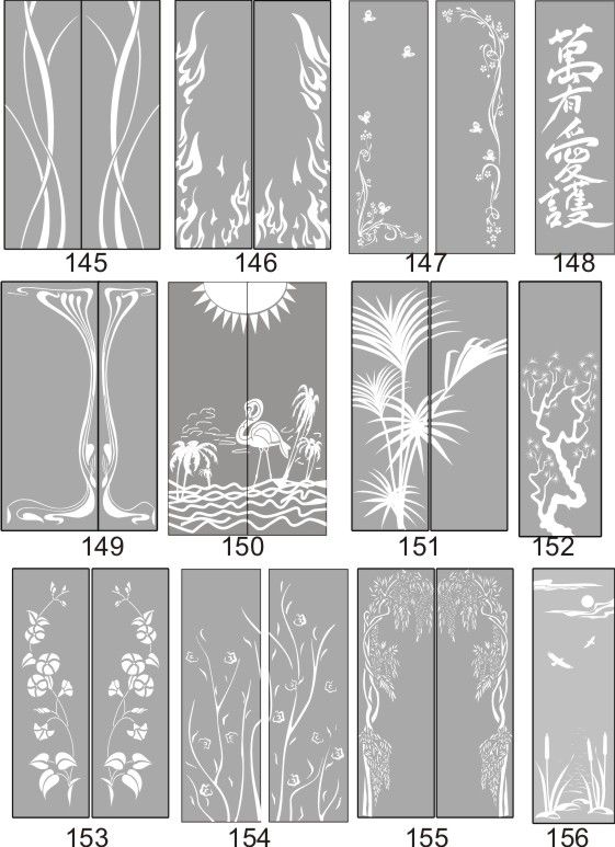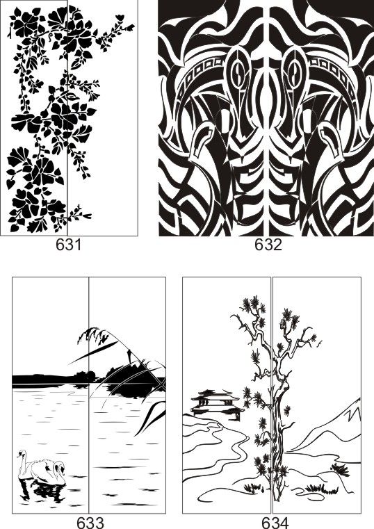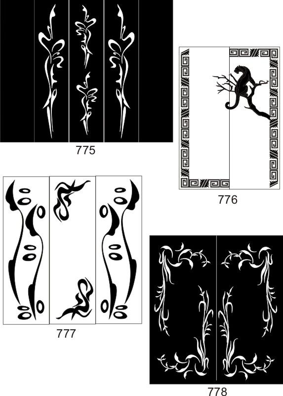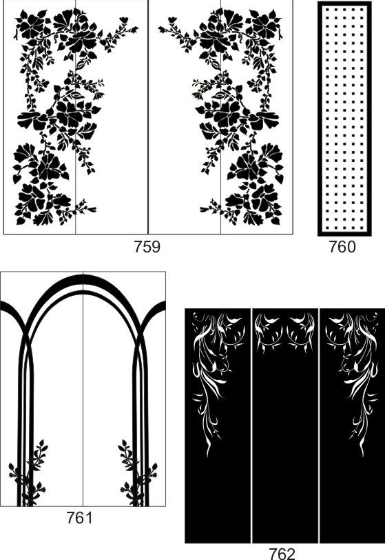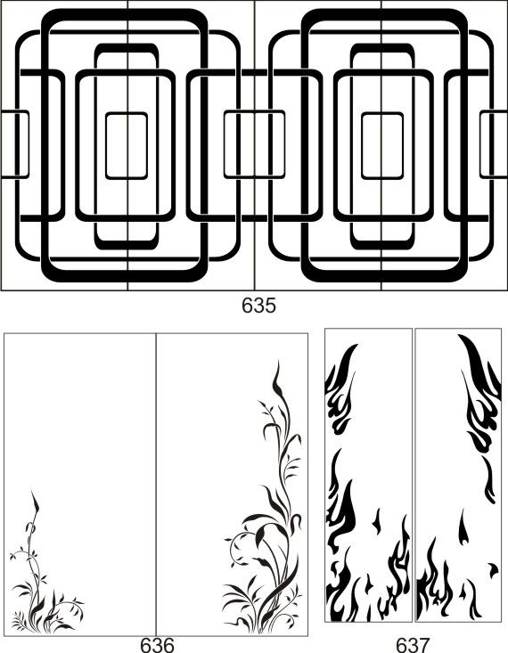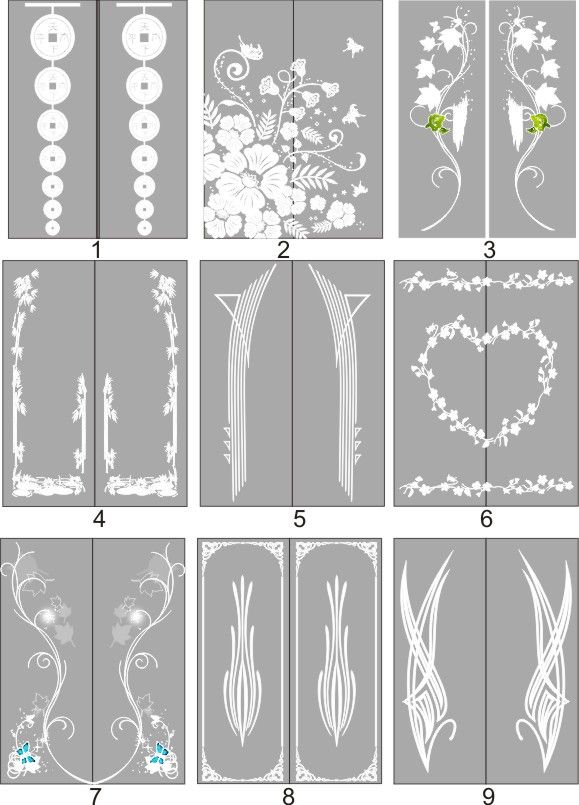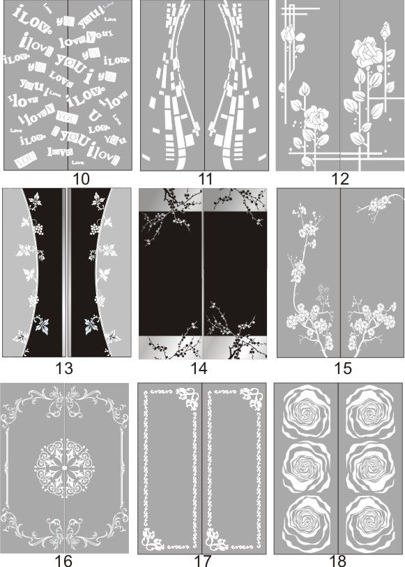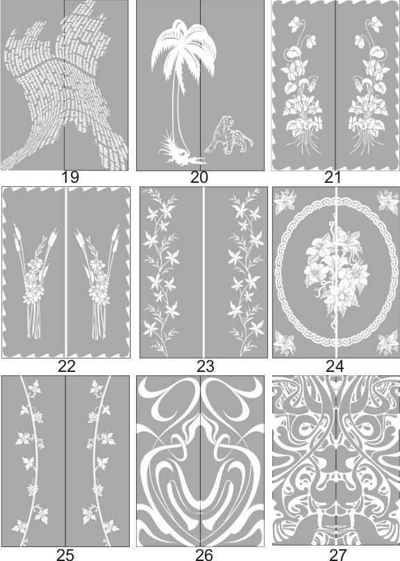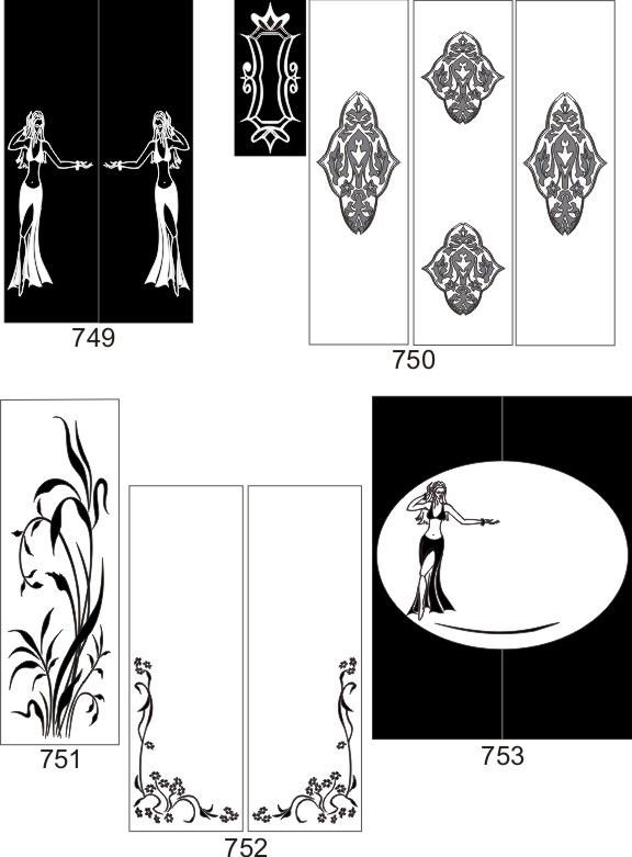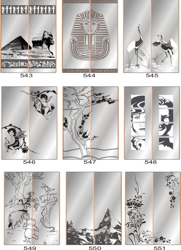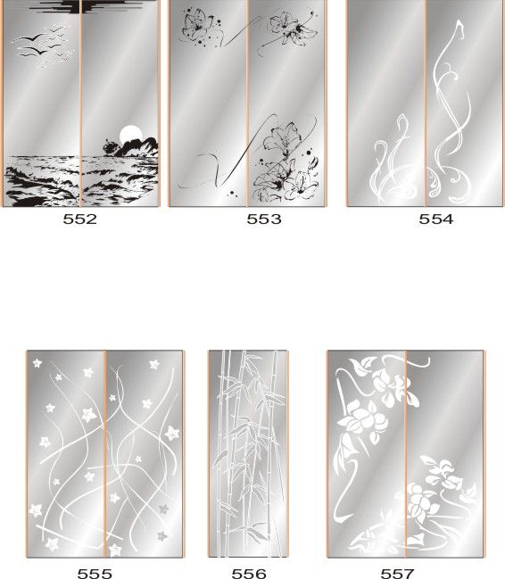 Если определённые участки заклеить специальной бумагой (трафаретом), то абразив будет воздействовать лишь на незащищённое стекло, благодаря чему можно получать рисунки. Чаще всего данное решение используется для изготовления зеркальных элементов мебели. Качественная пескоструйная обработка зеркала шкафа-купе позволяет придать ему оригинальную внешность. В нашей фирме предлагается большое количество интересных рисунков любых геометрических форм. Трафареты вырезаются на высокоточном плоттере.