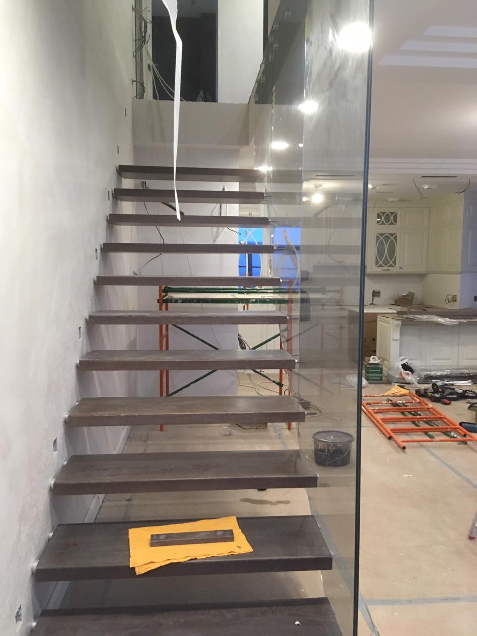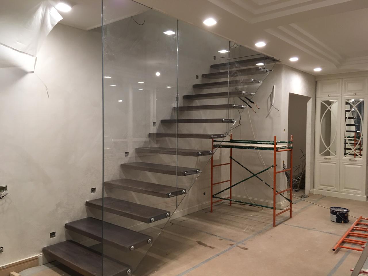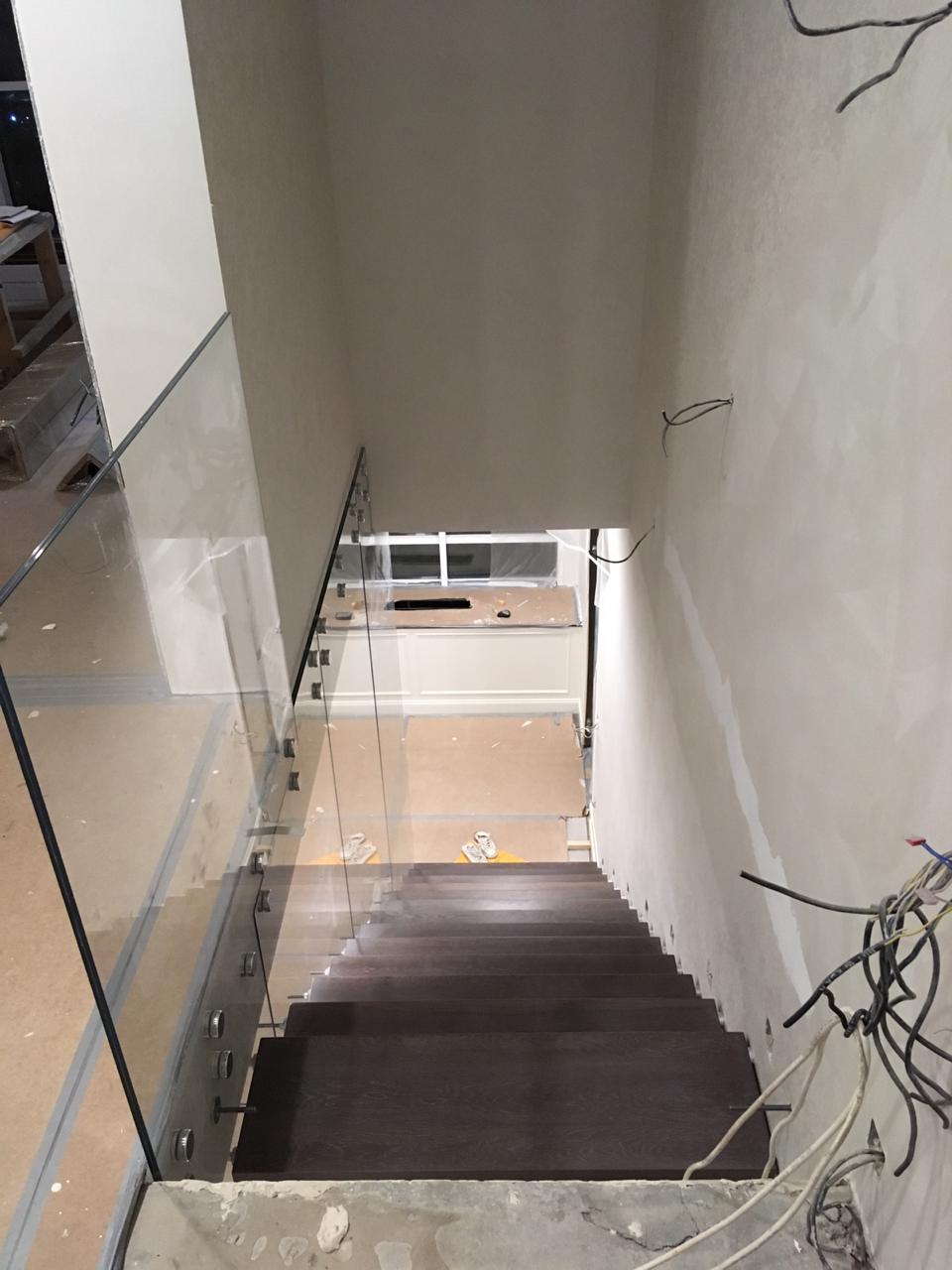 Стеклянное лестничное ограждение. Выполнено из прозрачного закаленного стекла 10 мм.