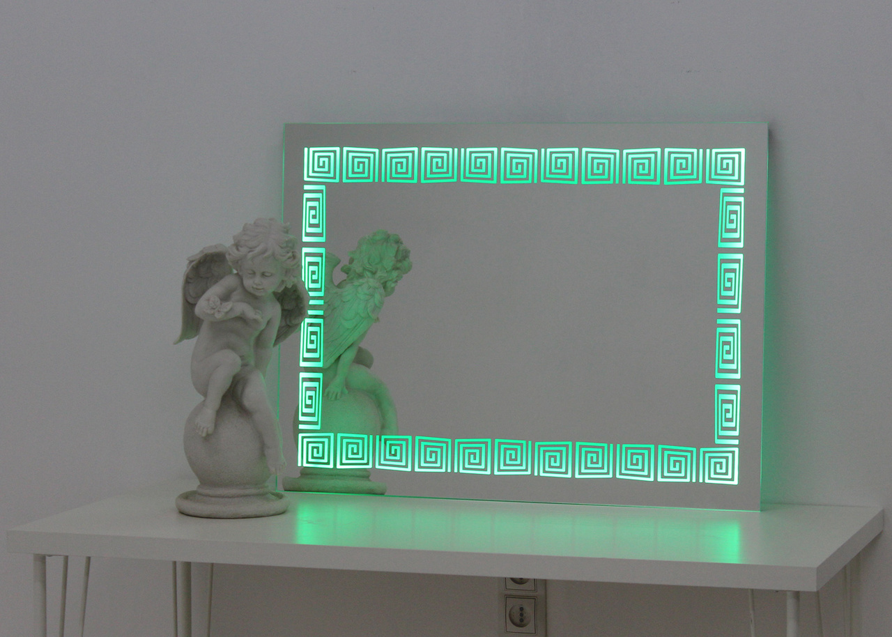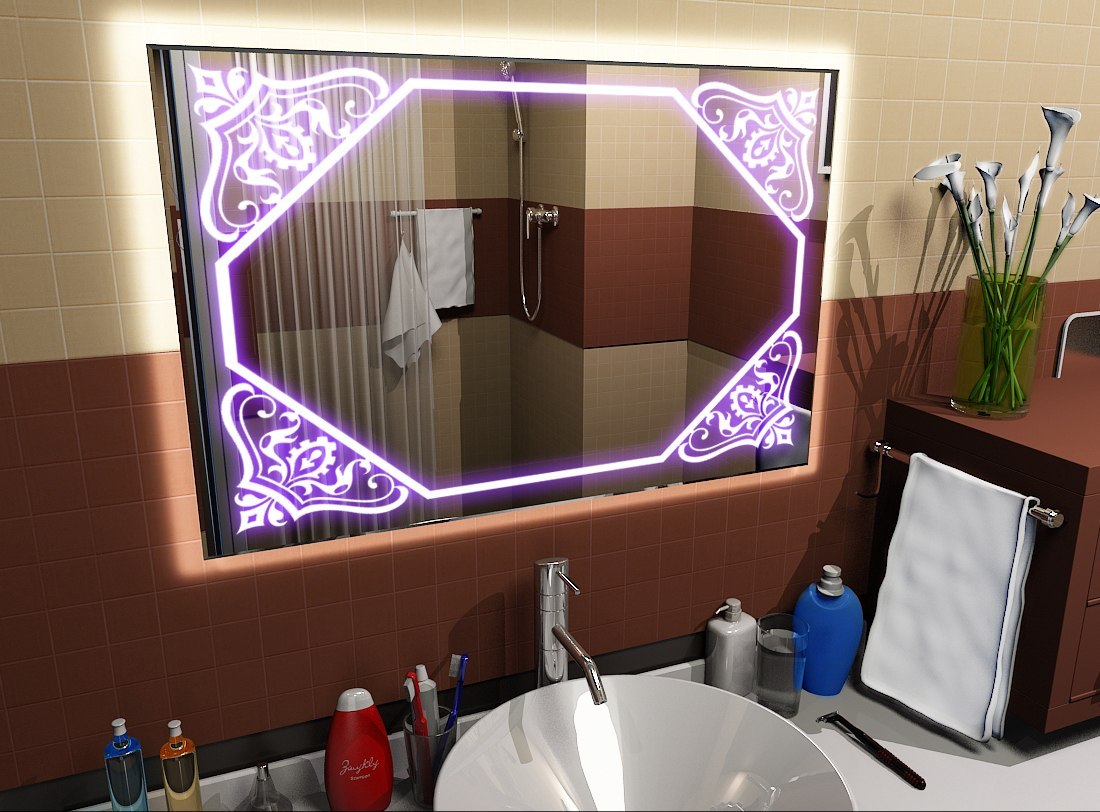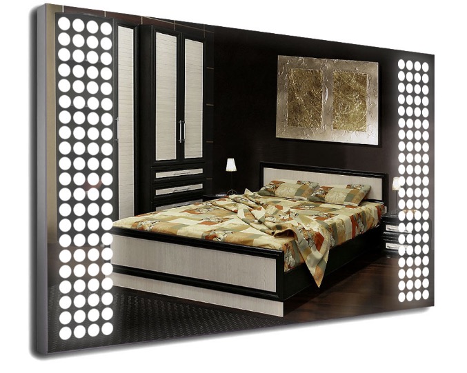 Подсветка устанавливается в виде энергоэффективных диодов. Это может быть классическая контурная LED лента, установка миниатюрных лампочек белт-лайт в верхней части или по периметру или только с боковых сторон.